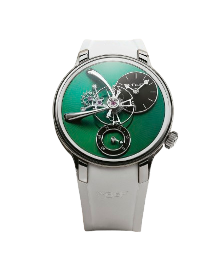 MB&F chose materials and colors that speak to a contemporary aesthetic. The case, crafted from modern titanium, features a dynamic interplay of brushed, polished, and matte surfaces that catch the light from every angle. The dial plates are offered in two striking new hues: a chic, on-trend salmon and a deep, complex “peacock green.” These vibrant backdrops make the sporty, black-accented time and power reserve subdials pop, creating a look that is both sophisticated and daring. The design is completed with an integrated rubber strap, seamlessly merging case and band to signal that this piece of art is meant for an active, curated lifestyle.
