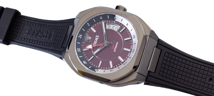 The V-Contempo GMT’s design is a study in controlled boldness. It forgoes the traditional round face for a powerful, softened square silhouette that feels both architectural and modern. The reviewed model features a sophisticated gun-metal toned steel case, which provides a dramatic frame for a striking burgundy dial—a color choice that is at once regal and contemporary. Every element is carefully considered, from the high-legibility markers to the subtle texture of the dial. And, of course, presiding at the 12 o’clock position is the unmistakable Medusa head, a symbol of uncompromising luxury and the brand’s enduring legacy.